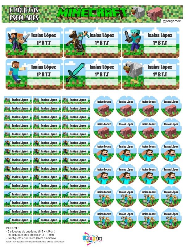 Etiqueta Escolar en Papel Autoadhesivo - MineCraft